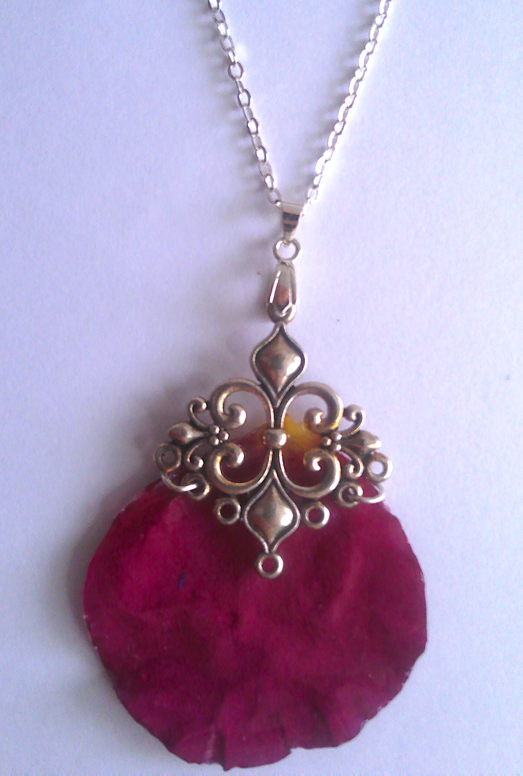 Chaîne avec pétale de rose véritable rouge vif et ornement.