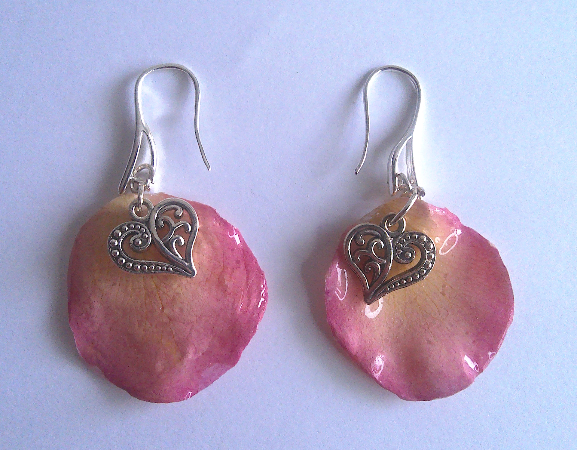Boucles d’oreilles avec véritables pétales de rose et petits coeurs.