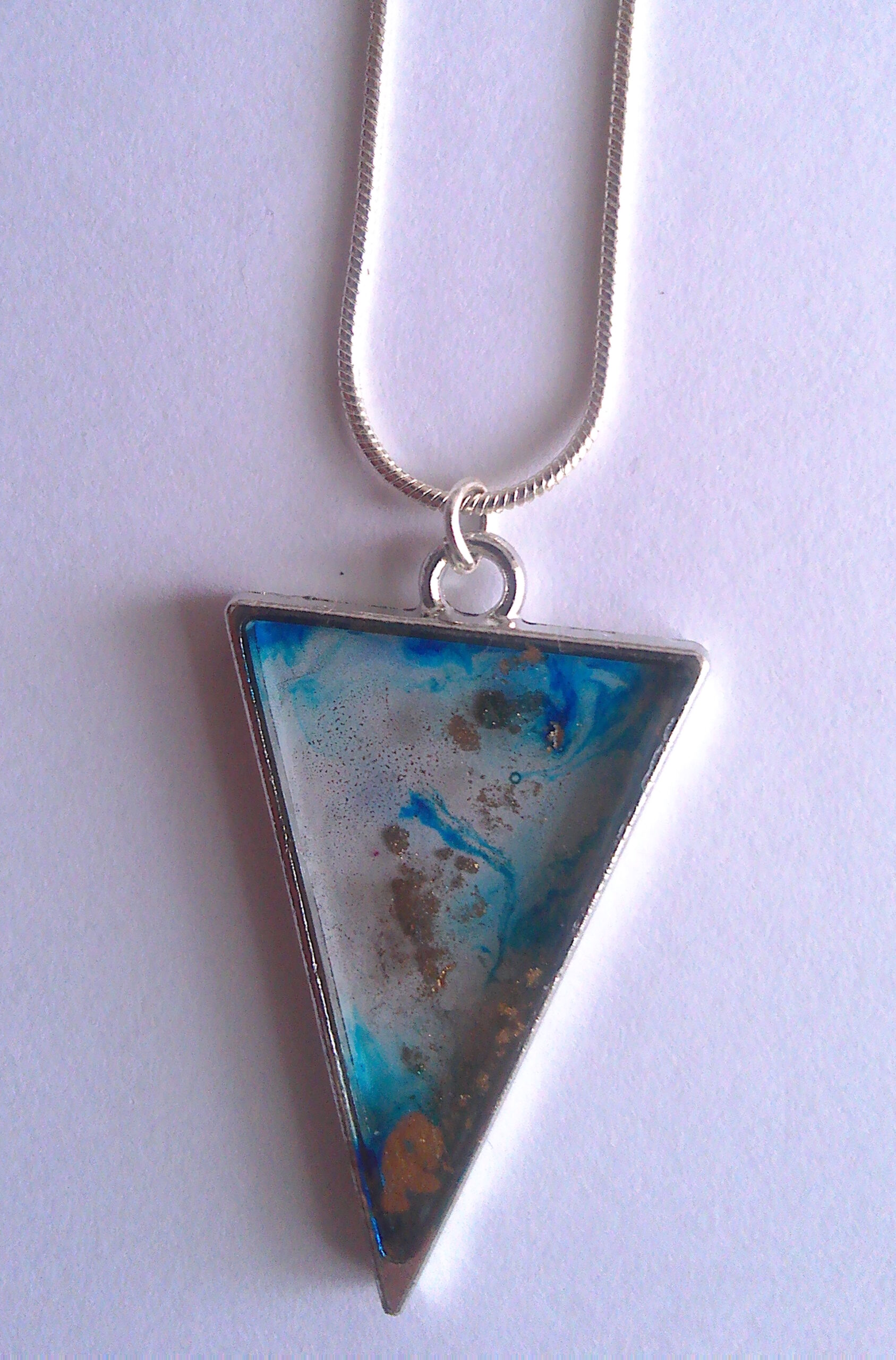 Chaîne avec pendentif triangulaire à l’encre bleue.